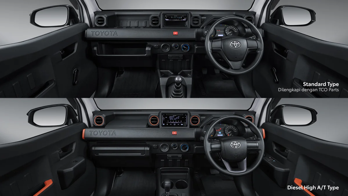 Interior Toyota Hilux Rangga 2026 difokuskan pada aspek yang paling terasa saat digunakan, seperti layout dashboard, posisi duduk, visibilitas, ruang kaki, serta konfigurasi kursi yang relevan untuk kebutuhan PICK-UP. Galeri interior juga membantu menilai kualitas material, desain head unit, fitur konektivitas, hingga ruang penyimpanan yang sering menentukan kepraktisan harian. Perbandingan visual antar Toyota Hilux Rangga 2.4 High MT (Pick Up), Toyota Hilux Rangga 2.4 High AT (Cab Chassis), Toyota Hilux Rangga 2.4 High AT (Pick Up), Toyota Hilux Rangga 2.4 Standard MT (Pick Up), Toyota Hilux Rangga 2.4 Standard MT (Pick Up 3 Way), Toyota Hilux Rangga 2.0 Standard MT (Pick Up 3 Way), Toyota Hilux Rangga 2.0 High MT (Pick Up), Toyota Hilux Rangga 2.4 Standard MT (Cab Chassis), Toyota Hilux Rangga 2.0 Standard MT (Cab Chassis), Toyota Hilux Rangga 2.0 Standard MT (Pick Up) memudahkan identifikasi perbedaan fitur kenyamanan dan kelengkapan kabin sebelum memilih varian.