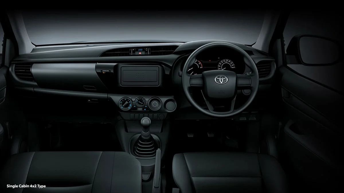 Interior Toyota Hilux S Cab 2026 difokuskan pada aspek yang paling terasa saat digunakan, seperti layout dashboard, posisi duduk, visibilitas, ruang kaki, serta konfigurasi kursi yang relevan untuk kebutuhan PICK-UP. Galeri interior juga membantu menilai kualitas material, desain head unit, fitur konektivitas, hingga ruang penyimpanan yang sering menentukan kepraktisan harian. Perbandingan visual antar Toyota Hilux S Cab Single Cabin 4WD Diesel, Toyota Hilux S Cab Single Cabin 2WD Diesel, Toyota Hilux S Cab Single Cabin 2WD Gasoline memudahkan identifikasi perbedaan fitur kenyamanan dan kelengkapan kabin sebelum memilih varian.