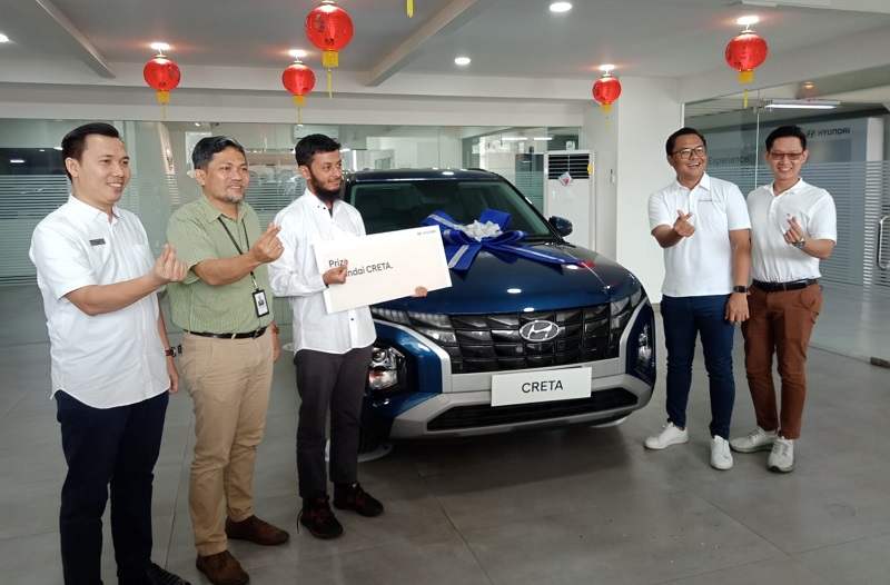 Penyerahan hadiah satu unit Hyundai Creta warna biru itu dilakukan oleh Chief Operating Officer PT Gowa Modern Motor (Hyundai Gowa). Turut pula hadir Regional Sales Deputy General Manager PT Hyundai Motors Indonesia, Rahisa Desrihadi, dan General Manager Hyundai Gowa Narogong, Sarif.